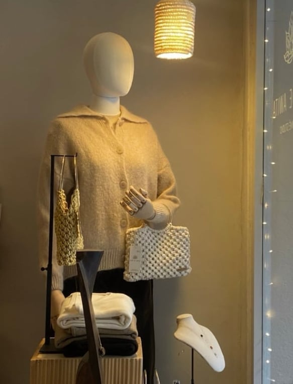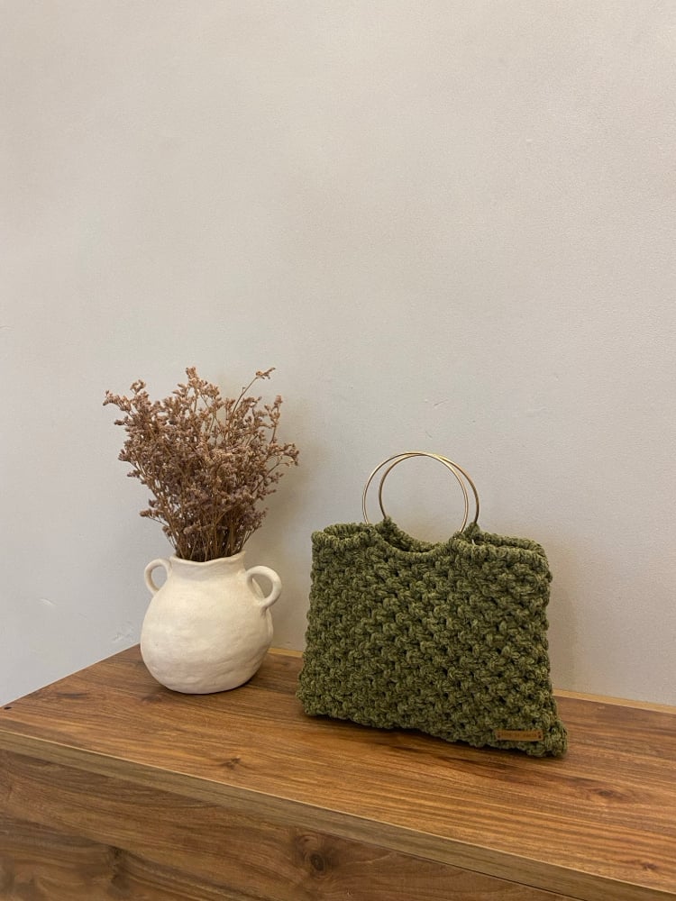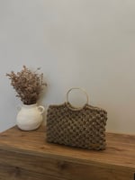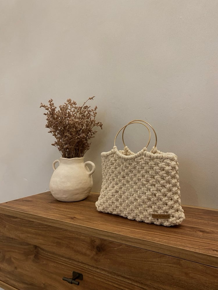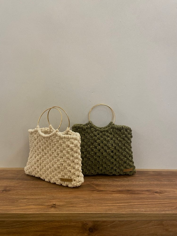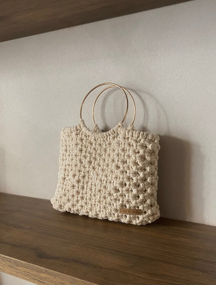 Bolso de mano tejido en macramé con cuerda aterciopelada y asas de metal.